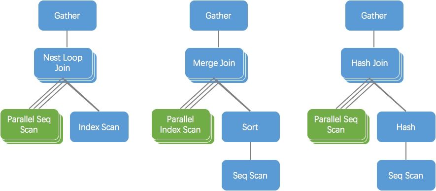 PostgreSQL 支持三种连接算法:NestLoop,MergeJoin 以及 HashJoin。其中 NestLoop 和 MergeJoin 仅支持左表并行扫描,右表无法使用并行;PostgreSQL 11 之前 HashJoin 也仅支持左表并行,PostgreSQL 11 支持了真正的并行 HashJoin,即左右表均可以并行扫描。