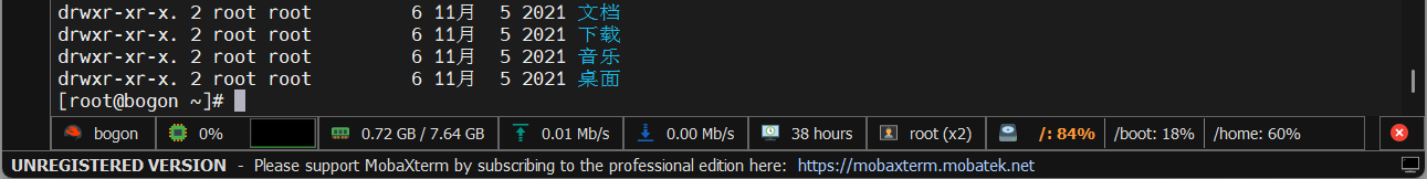 MobaXterm连接到主机后,在窗口底部会看到主机状态信息统计,包括:CPU、内存、网络、磁盘等,下图所示。